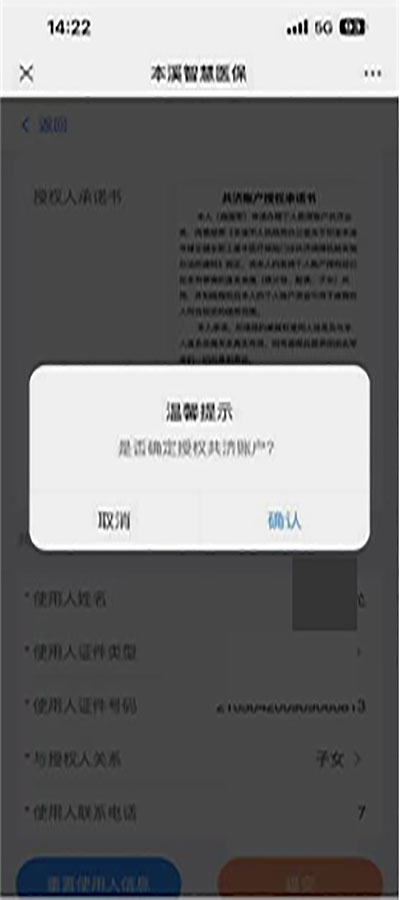 5.授权人输入共济使用人的正确信息,包括使用人姓名、使用人证件类型、使用者证件号码,选择与授权人关系(父亲、母亲、配偶、子女),并输入使用人联系电话等信息,点击提交按纽,弹出确认提交信息。