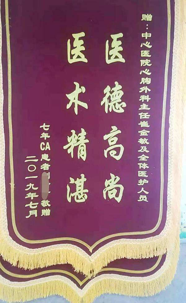 2012年6月26日,刘大哥被诊断为右肺上叶中心型肺癌,崔金敏主任与医疗团队在全麻下为患者行右肺上叶袖状切除、气管吻合、纵隔淋巴结廓清术。术后,刘大哥很快就恢复出院了。然而2014年9月25日,刘大哥因肺癌复发再次入住心胸外科,还是崔金敏主任与医疗团队勇担风险,在全麻下行右肺中下叶、隆突切除、气管成型、纵隔淋巴结廓清术获得成功。2019年6月26日,是刘大哥实施手术后的第7周年,他身体健康,状态良好,中气十足,红光满面,生活幸福。刘大哥非常感激崔金敏主任、周传江副主任及张秀荣护士长和心胸外科的全体医护团队,给了他第二次生命,更让奇迹发生在他的身上。自2012年以来,术后的每一年里,刘大哥都怀着感激之情,在他曾经手术的那一天来到市中心医院的心胸外科,向给予他第二次生命的恩人们送来锦旗,这已经是他送来的第七面锦旗了,刘大哥感谢之词溢于言,他希望每年都来看看大家。崔金敏主任说,锦旗不仅仅是患者对医护人员的赞许,更是对我们工作的肯定,更多的是一种鞭策,今后我们更要一如既往地做好本职工作,全心全意地为患者服务,让更多生命奇迹发生在身边。”