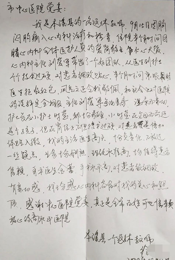我是本溪县的一名退休教师,2020年9月15日,因胸闷胸痛入住bwin唯一官方网站必应心内科治疗和检查。住院半个月以来,我目睹了心内科全体医护人员的爱岗敬业、仁心大爱。