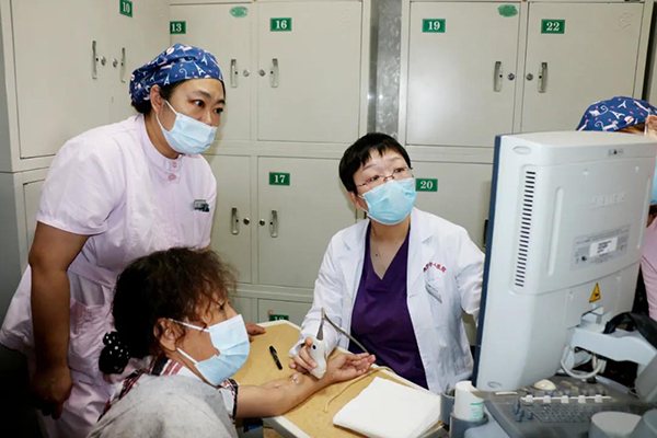 科室副主任王微现场为血透患者做了动静脉内瘘超声检查,让患者了解自己内瘘的血流情况,并讲解内瘘的相关知识,以及如何判断狭窄与血栓。