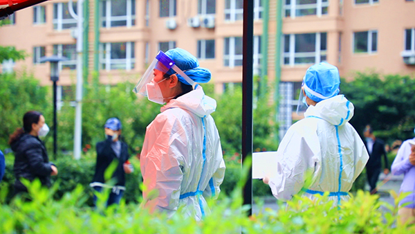 李佳徽、张淼、刘鸿冶、田帅与封控居家人员近距离采样,
